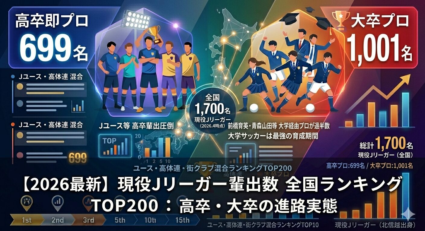 本記事では、2026年4月現在の現役Jリーガー全1,700名を徹底調査。全国200以上の組織からプロへ羽ばたいた選手たちの「最終所属」を特定しました。
