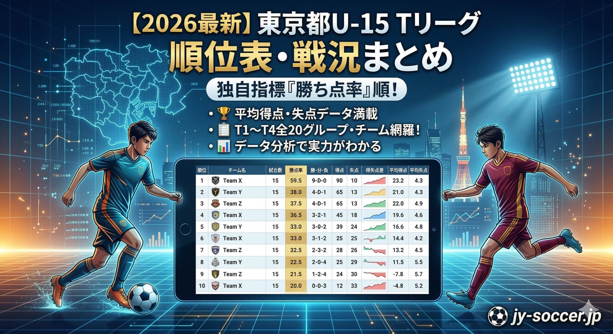 ジュニアユース年代のリーグ戦は、学校行事(修学旅行や体育祭)やグラウンド確保の都合などにより、チームによって消化試合数にどうしてもバラつきが生じます。 そのため、単なる「勝ち点の合計」で順位を見ると、試合を多くこなしているチームが上位に見えてしまいます。当サイトでは、試合数の不平等をなくし、各チームの「本当の立ち位置(実力)」をより正確に把握できるよう、1試合あたりの獲得ポイントである「勝ち点率」を基準に順位を掲載しています。